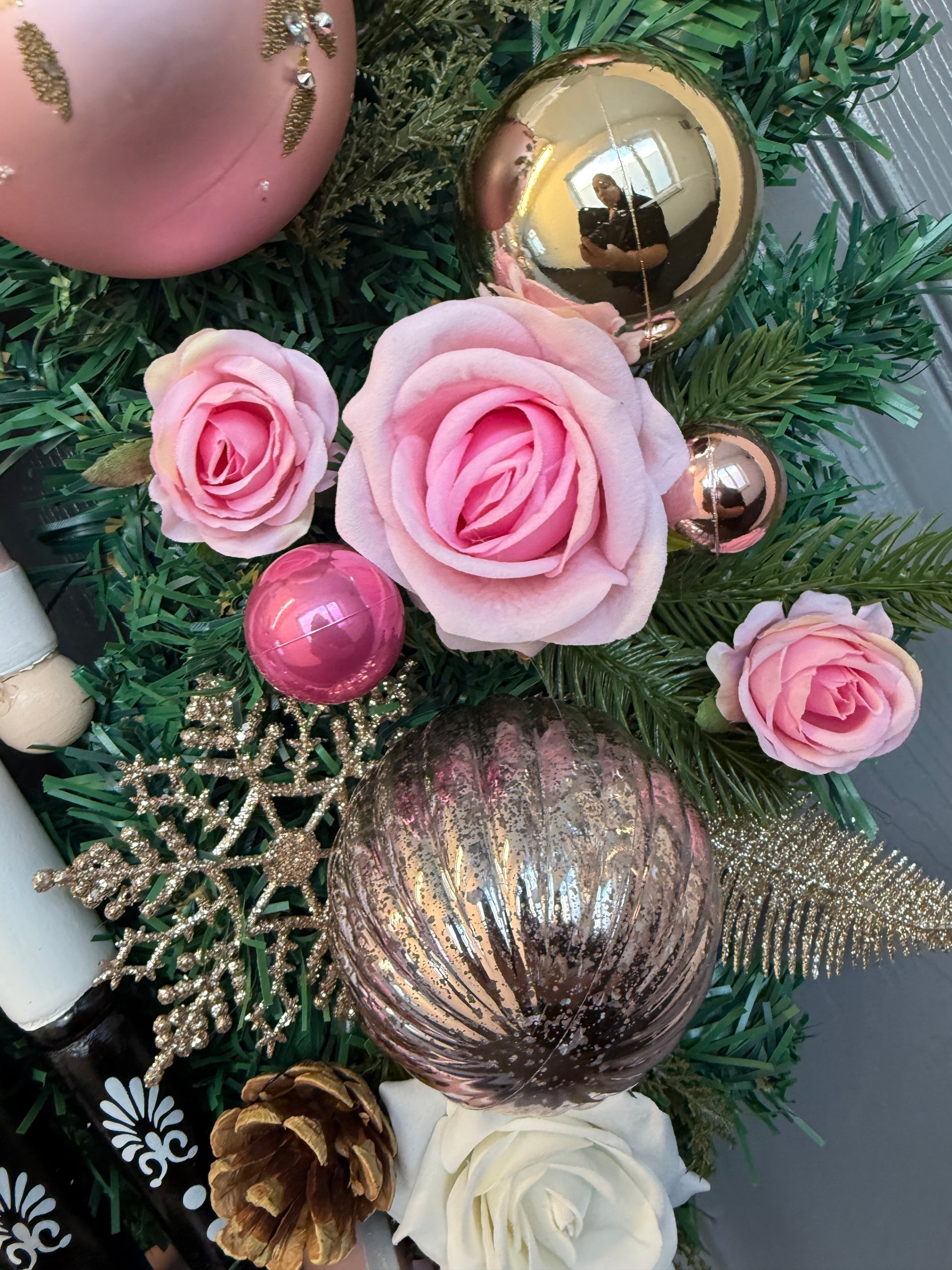At the heart of this wreath sits a 38cm traditional wooden nutcracker, surrounded by a rich blend of festive textures and colours. Featuring round baubles in mixed sizes, velvet roses, gold feathers, pine cones, Gold glitter snowflakes, and mini silk roses, this wreath combines classic Christmas charm with elegant modern styling.